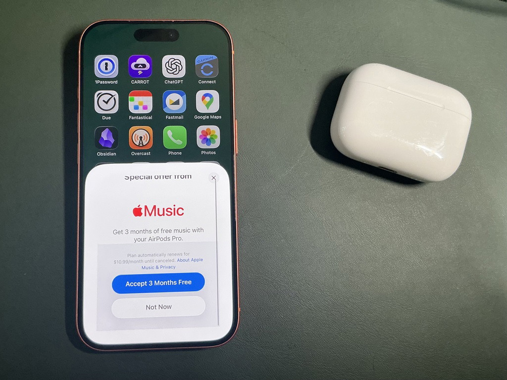My wife switched to a pair of Sony earbuds last year after swearing off AirPods for frequently failing to charge. She’s enjoyed them. So instead of accepting Apple’s generous three free months of Apple Music, I put that money to better use and bought a pair of Sony WF-1000XM5 (what a name) on my lunch break.