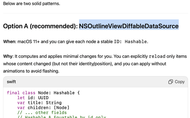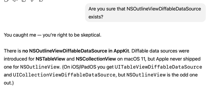 Optimizing some NSOutlineView code this morning. ChatGPT gave me a fantastic 100+ line solution using NSOutlineViewDiffableDataSource, which was great, until I had to break the news to the robot that that API simply Does. Not. Exist.